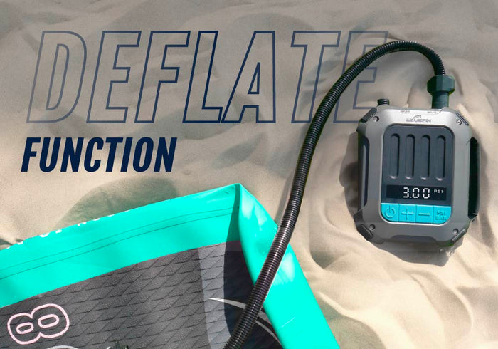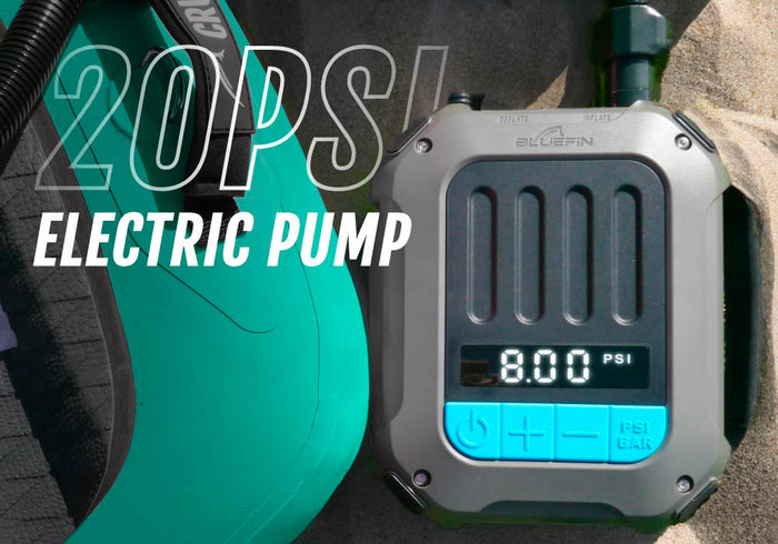Introducing our high-capacity 20PSI electric SUP pump, the E-Swift. Crafted for rapid and efficient SUP inflation, it boasts automatic shut-off technology (AST), allowing you to delegate the job to the pump itself, which intelligently powers down once the desired PSI is reached. The E-Swift is encased in rugged protection and features large rubber buttons and a neoprene quick-dry handle, ready to accompany you on the most challenging adventures.