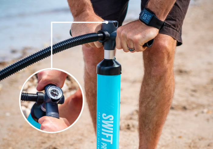 Engineered for ultimate convenience and efficiency, this pump inflates your SUP with every up and down motion, doubling the speed at which you can prepare for your aquatic adventures. Additionally, our pump features a built-in pressure gauge, ensuring you achieve the perfect inflation level for optimal performance.